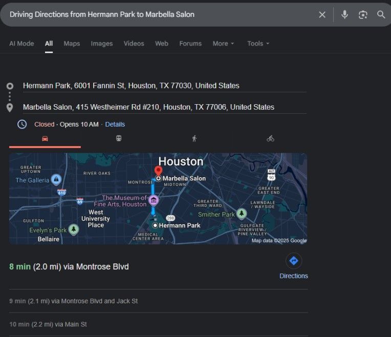 To reach Marbella Salon from Hermann Park, head west on Hermann Drive, continue on Montrose Boulevard, and then turn left onto Westheimer Road. The salon will be on your right-hand side — a convenient and central location for Houston locals and visitors.