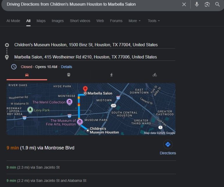Visiting Children’s Museum Houston and looking for some self-care time afterward? Marbella Salon is conveniently located just minutes away. The route from the museum to 415 Westheimer Rd #210 is straightforward — travel west along Binz St, continue onto Richmond Ave, and turn onto Westheimer Rd. You’ll find Marbella Salon near popular restaurants and shops in Houston’s lively Montrose area.