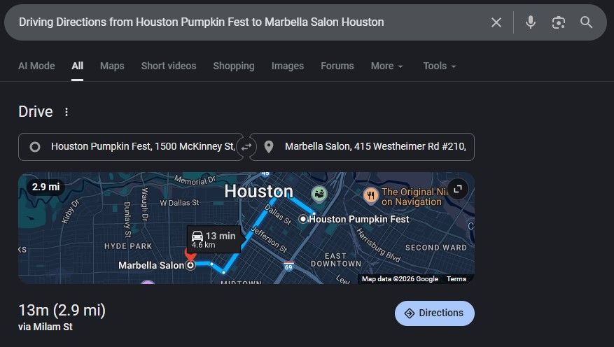 Driving Directions from Houston Pumpkin Fest to Marbella Salon